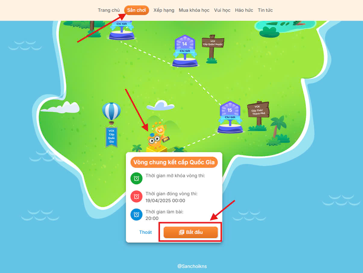 - Học sinh cần kiểm tra tài khoản đã được duyệt bằng cách => Ấn vào VCK cấp Quốc Gia => Nếu có nút "Bắt Đầu" là tài khoản đã được duyệt và sẵn sàng tham gia./ Nếu chưa có nút "Bắt Đầu" hoc sinh cần liên hệ BTC để được hỗ trợ