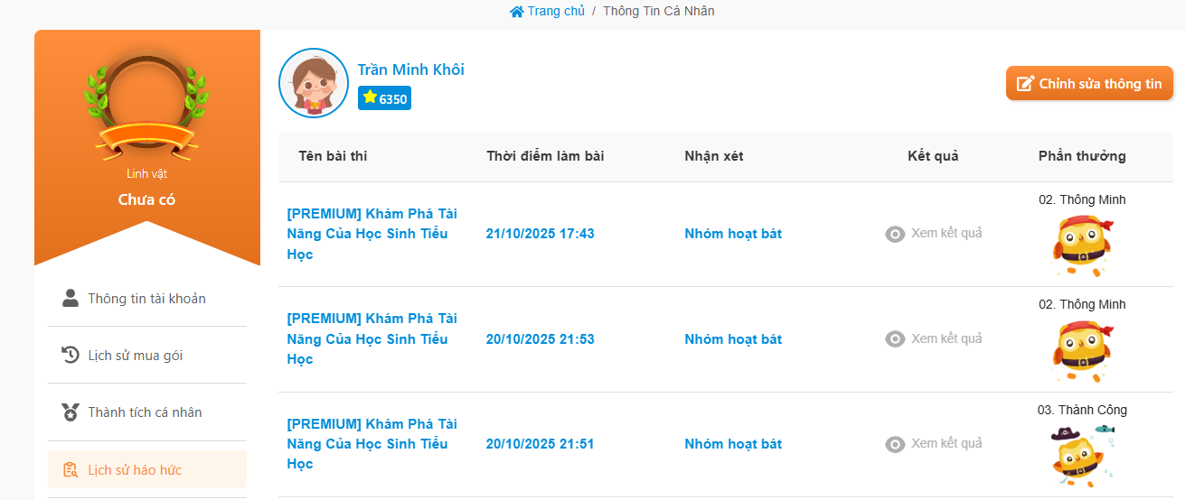 | Bước 4 | KIỂM TRA HUY HIỆU đã tích lũy: Đăng nhập --> Thông tin cá nhân --> Lịch sử Háo hức: | ![]() |