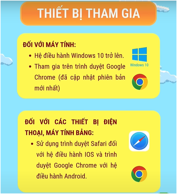 - Học sinh tham gia trên máy tính của địa điểm thi, laptop, ipad, điện thoại cá nhân (nếu có)... theo điều kiện cơ sở vật chất của cá nhân và từng đơn vị quy định.