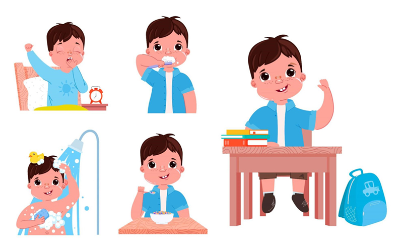 Tuỳ theo độ tuổi và điều kiện sống, trẻ được rèn luyện việc chăm sóc bản thân về cả thể chất và tinh thần, từ những việc làm đơn giản đến phức tạp, sẽ hình thành những thói quen và lối sống tốt đẹp cho trẻ. Với học sinh tiểu học, trẻ có thể tự làm những việc nhỏ như tự biết ăn, biết ngủ, tự đi vệ sinh, dọn dẹp chăn gối, tự biết thay quần áo, tự biết cho quần áo bẩn vào máy giặt và giúp đỡ cha mẹ những việc đơn giản. Khi giao cho trẻ một công việc, trẻ sẽ thấy mình là người quan trọng trong gia đình và có trách nhiệm thực hiện công việc một cách tốt hơn.