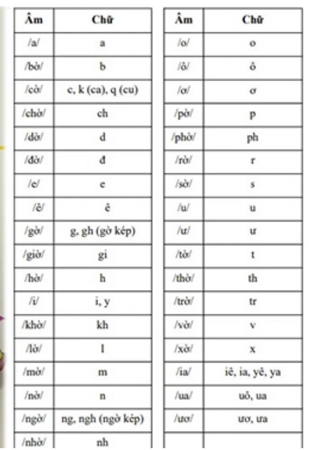Bảng chữ cái tiếng Việt là bai học vỡ lòng khi các bé bước vào lớp 1, thậm chí là ở mầm non. Theo Bộ GDĐT Việt Nam, có tổng cộng 29 chữ cái trong hệ thống tiếng Việt, sắp xếp theo thứ tự như sau: a, ă, â, b, c, d, đ, e, ê, g, h, i, k l, m, n, o, ô, ơ, p, q, r, s, t, u, ư, v, x, y. Thứ tự này được sắp xếp theo cách đọc từ xưa đến nay, cũng như theo bản phiên âm quốc tế.