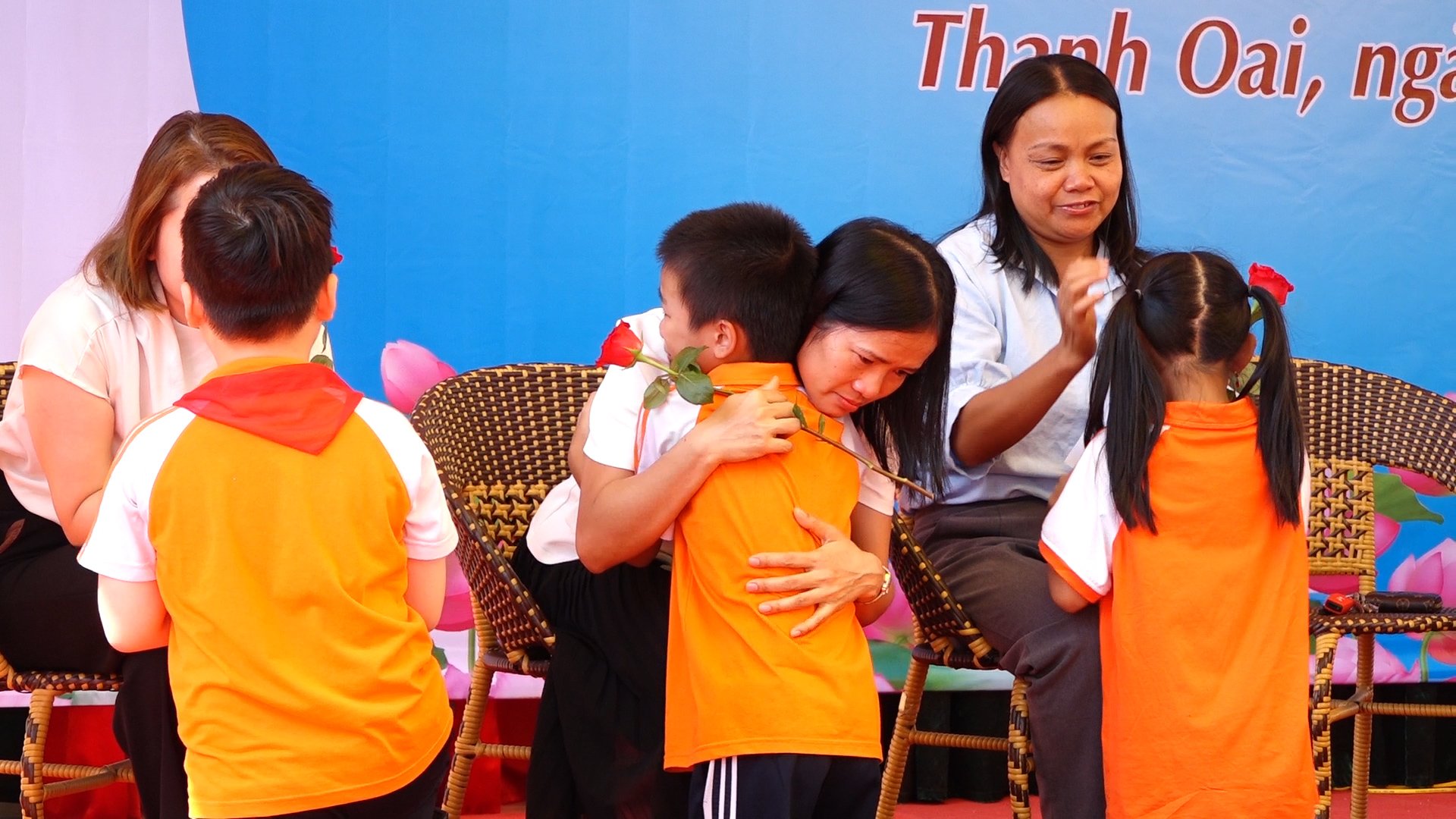 Hào hứng, sôi nổi, những tiếng hò reo, những đôi bàn tay bé xíu trên sân trường Tiểu học Kim Bài, những gương mặt trẻ thơ, ánh mắt hồn nhiên trong trẻo vô cùng hạnh phúc khi được gửi tặng mẹ những món quà vô giá, những lời nói yêu thương, những cái ôm ngọt ngào, những cái nắm tay thật chặt không chỉ dành cho người mẹ của mình mà còn dành thật nhiều tình cảm cho các cô giáo, người mẹ hiền thứ 2 của các em học sinh.