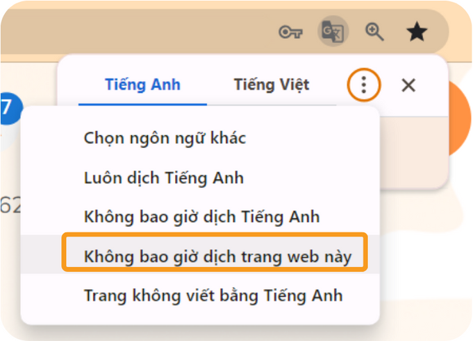 2. Nhấn nút tuỳ chọn và chọn “Không bao giờ dịch trang web này”.